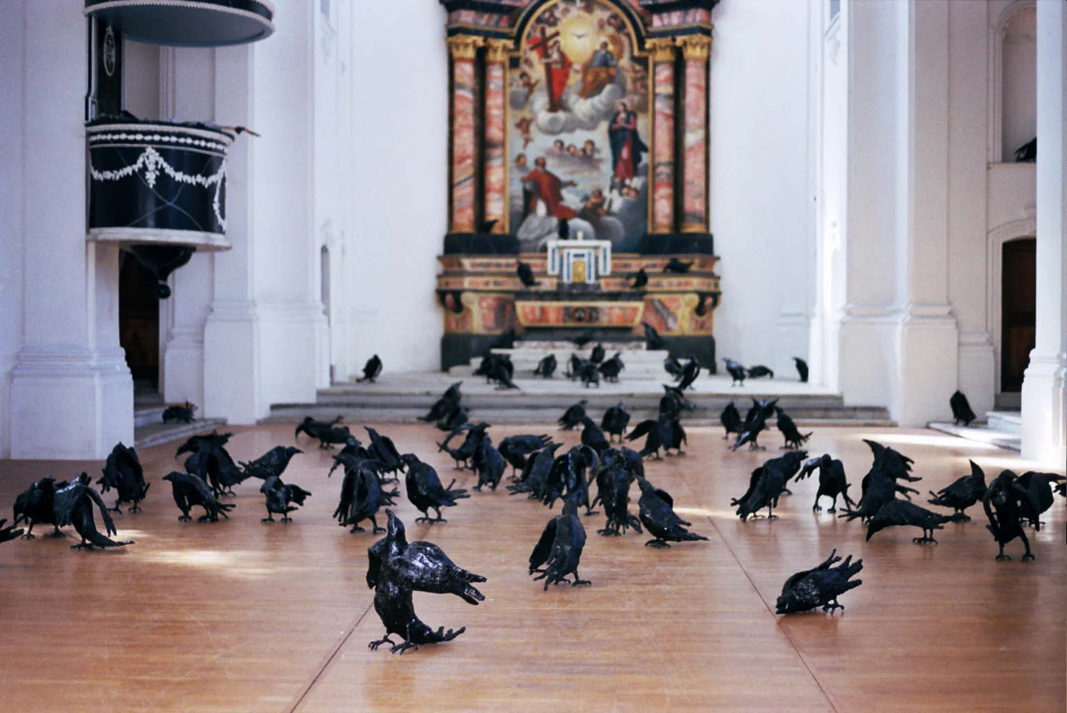 It was presented in five desacralized religious spaces transformed into art and cultural venues. It is an installation that consists of 100 sculptures of crows, each a unique piece, installed in the specific exhibition space, which pose a relationship between symbolism and sculptural narrative. The project was presented in 2002 at At Home Gallery, Samoria, Slovakia, and Tranzit Foundation Cluj, Romania, in 2003 at the Maribor Synagogue with the Kibla art Foundation of Slovenia, and at the Eglise des Jesuites of Sion, venue runned by the Museum of Fine Arts of this Swiss city. In 2005 a new presentation took place in the Mönchkirsche of Salzwedel, Germany, organized by the Kulturamt of the city.