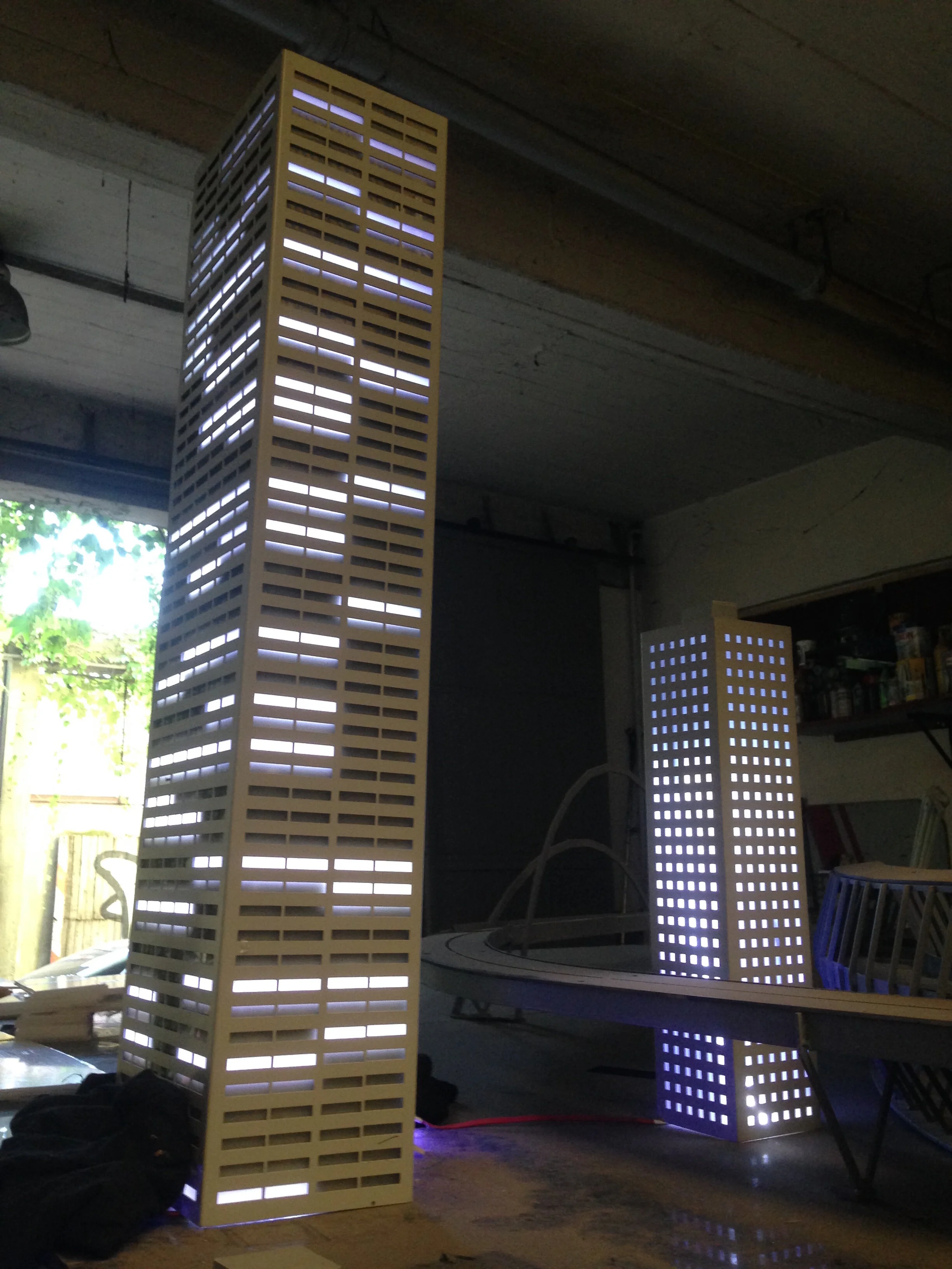 CNC cut metal and acrylic, 3D printed elements, vinyl, leds, liquid, sound and light installation| Dimensions : 600 cm x 400 cm x 500 cm