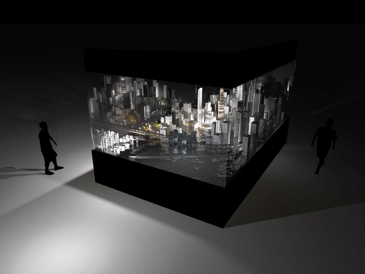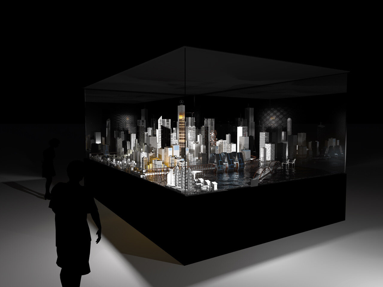 BIOCENOSIS is a 24 m2 model of a city formed by 430 buildings of different typologies made out of metal, aluminum, 3D printing, acrylic, steel and LEDs. A large team of architects, welders, electronic engineers, acoustic researchers, physicists, chemists, artists and assistants worked for over 6000 hours to achieve the production of the project: an eco-sensitive urban landscape ravaged by a climatic phenomenon that keeps it flooded under the effects of a permanent storm. "...in the model of this city half-submerged into the disaster," writes Pedro Donoso, "we unfold as observers of a time machine and as subjects of an advanced desire for survival. Our architecture will be a social sculpture of metal and lights that shine day and night. From a possible model, the replica wants to introduce us here in the seductive beauty that awaits us in a society whose functioning network shows itself to be both machine-like and sensitive at the same time, like a great multisensory organism."